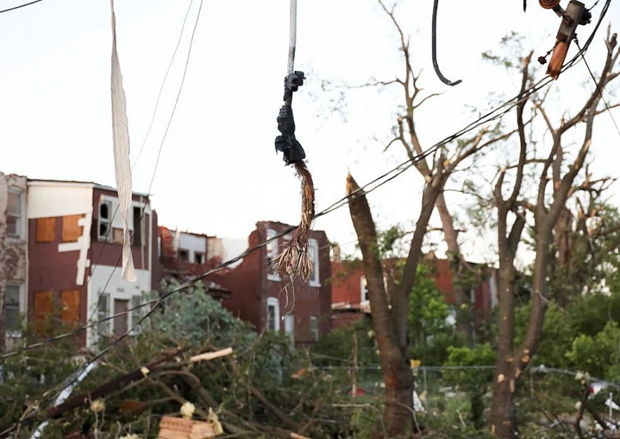 | A broken and exposed power line hangs over storm debris, after a powerful tornado ripped through the city of St. Louis, Missouri |